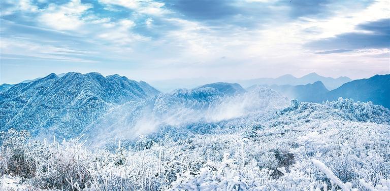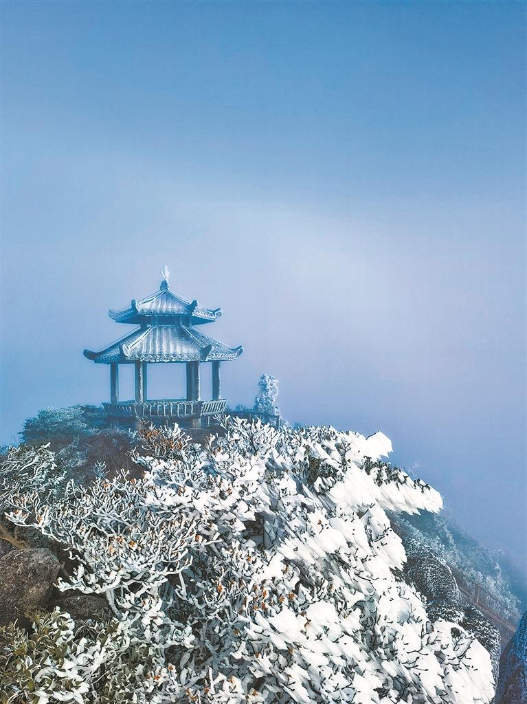 近日,龙岩多地冰雪盛景亦如期而至。自南天山的山脚往上看,整座山被茫茫雾气所笼罩,一派粉妆玉砌,登上顶峰,俯视群山,山峦在云海和雾凇中如梦似幻,积雪不厚,还能在雪中看到“秋天的痕迹”,黄色落叶与白色雾凇,上演一部“色彩大片”。