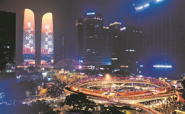 2023年12月31日,各地张灯结彩,在璀璨光影中迎接新年到来。图为成都天府双塔和立交桥“交子之环”灯光璀璨。 (新华)