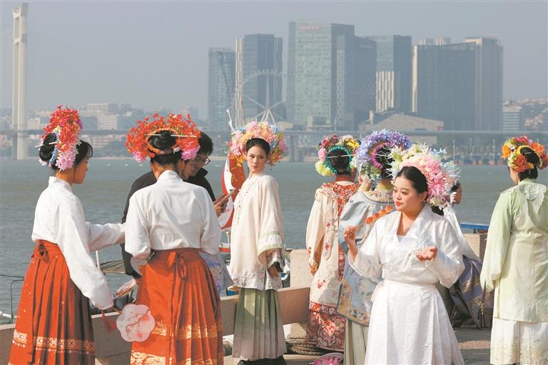 ▲元旦假期,在丰泽蟳埔社区,随处可见头戴簪花围的游客。(陈晓东 摄)