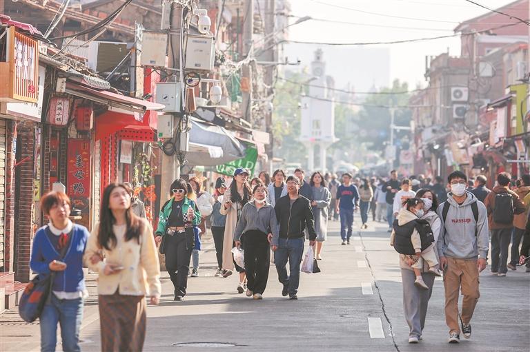 元旦假期,全市以泉州古城为依托,进一步丰富世遗游产品体系,逛世遗、游古城游客络绎不绝。府文庙广场前举办“漫游泉州宋元风华”百姓大舞台,众多闽南传统非遗展演轮番上演;肃清门广场开启2024年第一期润物无声文创市集,世遗元素、非遗传承、原创品牌等齐亮相;中山路、西街等地推出街头艺术展演活动,街头艺人们在表演中与观众互动,提升市民游客沉浸体验感;网红“铛铛车”在假日期间运行,串联起中心市区多个世遗点,打造世遗旅游观光线路,进一步提升世遗泉州品牌热度。