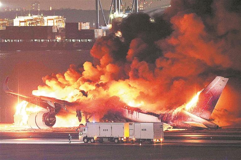 日本广播协会视频显示,18时许,516航班机身窗户冒出火焰,机身被大火包围,消防部门正在全力灭火。