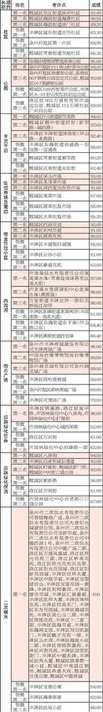 2023年11月份,市城管局考评中心抽评中心城区69个社区、84条主次干道、114个住宅小区、26个街旁广场、60条内沟河、6条江岸带、33座市场、88座公厕、59条道路绿化、173个二次供水单位、12座公园,共发现问题7684处。各区综合成绩如下:泉港区83.36分,鲤城区82.49分,丰泽区82.11分,泉州开发区81.28分,洛江区80.46分。
