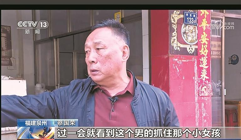 去年10月8日,蔡国荣在家中突然听到房屋外传来吵闹声。打开窗户后,他看到一楼某店铺门口有一名陌生男子(犯罪嫌疑人杨某)右手手持砖头、左手勒住一名小女孩。