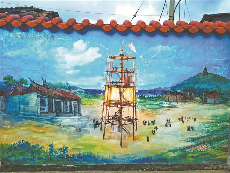 笔者曾在2019年为苏厝村组织彩绘壁画《苏厝结狮塔》,当时遍访村中90多岁长者,竟无人目睹苏厝狮塔,仅靠口口相传,略知一二。后来,才从笔者岳父黄旭东的台湾挚友黄厚源(1920年出生于当时的晋江县龟湖乡埔仔村,后徙居台湾)的一篇文章《话说老家人与地》找到线索:“最能体现龟湖普度特色的,是那些有钱人搭建的醮坛和‘禾山’,都是独资建造的。对于小孩子来说,我们喜欢有多些的禾山;这是在较大的戏台上布置假的山水风景,搭配活动车船与人物模型;有的是模拟某一戏文中的情景人物,有声有色,惟妙惟肖;就和台湾的电动花车布景一样。而成年人流连欣赏的是醮坛,俗名结坛仔,醮坛布置不单一面,而是四面立体的,台子成四方形,宽度、高度都约为禾山两倍,不管从哪一面看都是正面,布景也不是用纸裱糊的或油漆的,而完全是用檀香木嵌象牙玉石的屏风来作装潢……坛上请来衣冠楚楚的南管或北管吹奏演唱,别有一番韵味。观众熙来攘往,摩肩接踵,深夜不散。”