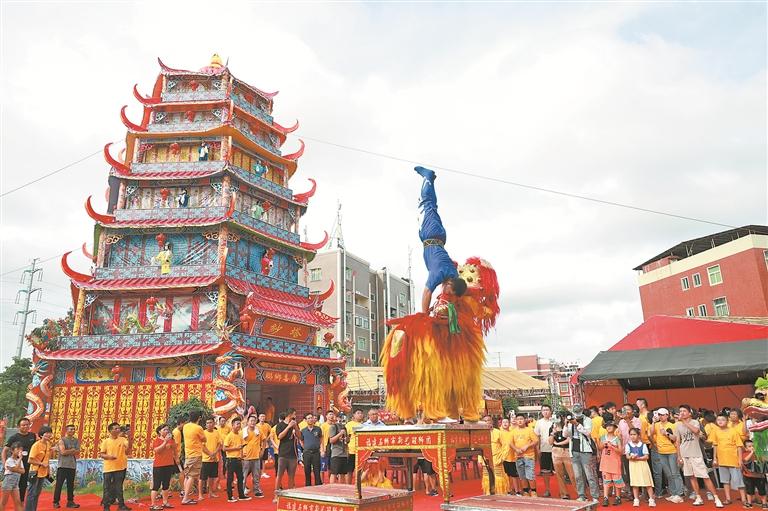 石狮的“龟湖大普”颇有特色,是把古泉州府晋江县廿四都龟湖塘周边村落分属12个生肖,12年里按生肖顺序各轮流做东一次。历史上,龟湖塘附近村落百姓出洋经商谋生者多,海上航行风险大,祈福求安的普度习俗形成较早,最具龟湖特色的便是“狮塔”。