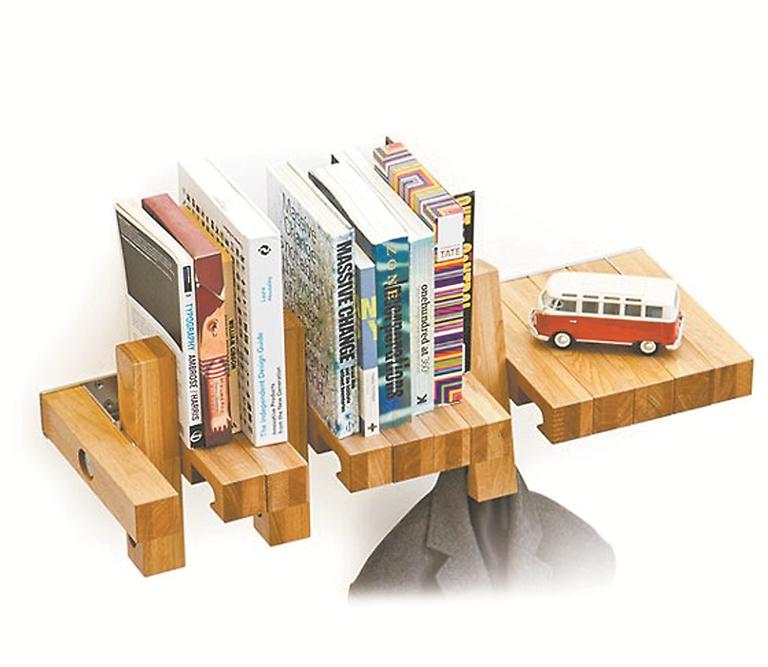 这是个多模块元件制作而成的书架,所有的模块都设计成围绕中心轴承,通过旋转控制,可以通过配合来夹住支撑书籍,底部部分也是悬挂装置,用来悬挂你喜欢的任何东西。此外它可以结合你的空间需求来决定定制多少个架子,确保空间得到最充分的利用。