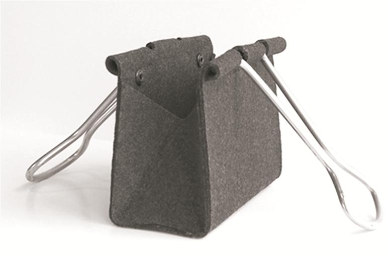 这个手提包借鉴了夹子的模样与功能,利用毛毡和铝管材加工而成,使用时将它像夹子一样打开,东西放进去后再合起来夹住,一切看起来是那么顺其自然。