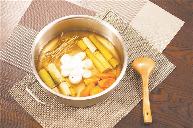 比如甘蔗,中医认为有生津、下气、润燥、补肺益胃等多种作用,适宜在寒冷干燥的冬日食用。在调饮师黄淼淼看来,甘蔗也适合拿来作为调制热饮的主材,并且可以与其他有甜味的蔬果搭配,例如清甜爽脆的荸荠、香甜可口的红萝卜,加了这两样甜材,熬煮出的甘蔗热饮所具有的生津润燥作用会更为突出,兼具止咳化痰、润肺排毒、健脾养胃等食效。