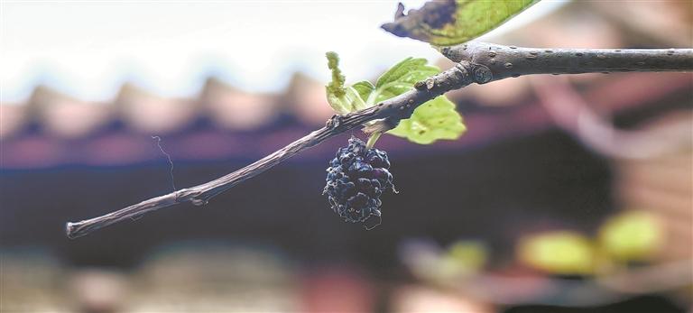 去年台风“杜苏芮”过后,古桑的枝叶被修剪了不少,但蓬勃的新芽仍悄然冒出头来。树梢,两颗熟得发紫的桑葚并头靠在一起,不远处,另一颗桑葚也在风中致意。驻足细看,绿叶掩映间,无数淡绿色细细碎碎的小花簇成毛茸茸的一团,那便是桑树花了。晴好的冬日,绿叶、蓝天、古寺的屋脊,三颗桑葚被映衬得如此独特、静谧。