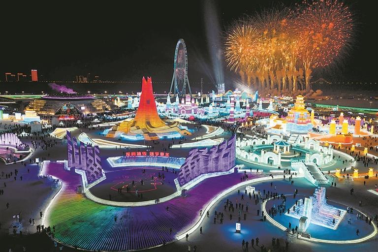 近日,在黑龙江哈尔滨举行的“2024中国冰雪旅游发展论坛”上,哈尔滨冰雪大世界以园区面积816682.50平方米成功挑战吉尼斯世界纪录,获得“世界最大的冰雪主题乐园”称号。图为1月5日,冰雪节启幕焰火在哈尔滨冰雪大世界园区上空绽放(无人机照片)。(央视 新华)