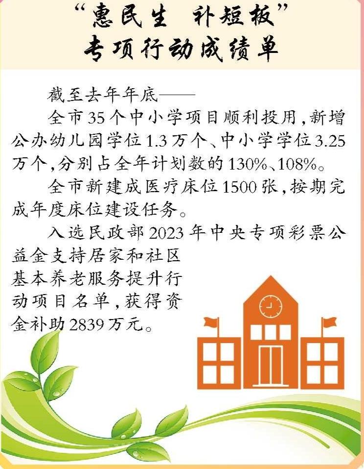 去年以来,我市扎实推进“惠民生 补短板”专项行动,用心用情用力解决好群众在教育、医疗卫生、养老等方面的急难愁盼问题,持续增进民生福祉。