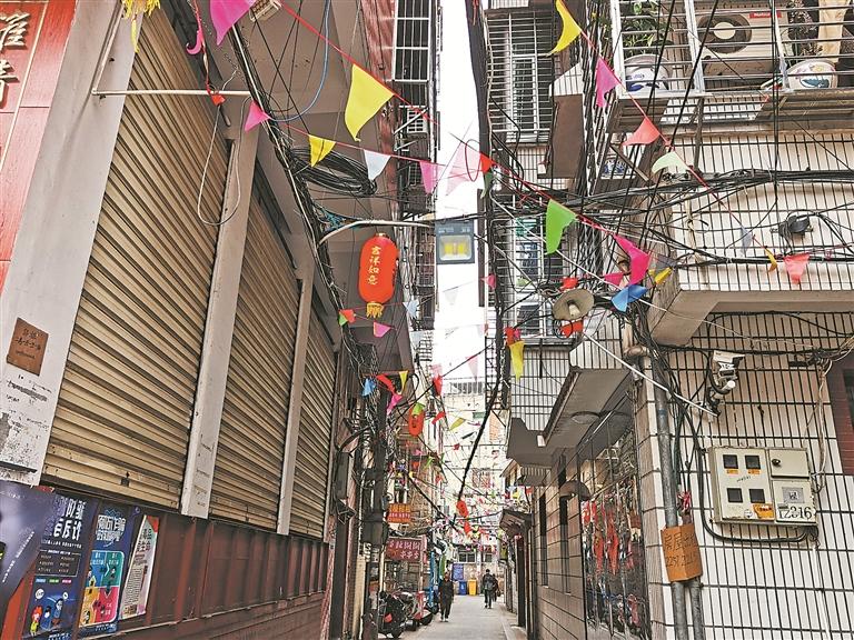九灌路周边有很多小巷子,这些巷子并不宽,但巷内房屋密集。记者看到,很多线缆直接从住户家中牵出来,这些线缆有电力、网络、有线电视、监控设备等各类线路,它们交叉、缠绕着,上面满是灰尘。放眼望去,九灌路上空犹如有一个巨大的蜘蛛网。而在宝洲街332号巷,整条巷子的线缆上还被人挂满了彩旗和灯笼。