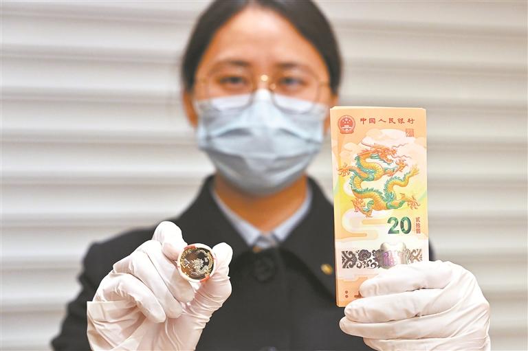 1月9日,由中国人民银行发行的2024年贺岁双色铜合金纪念币和纪念钞开始兑换。双色铜合金纪念币面额10元,发行数量1.2亿枚;纪念钞面额20元,发行数量1亿张,纪念币和纪念钞均采取预约兑换方式发行。图为中国建设银行北京兴融支行的工作人员展示2024年贺岁双色铜合金纪念币和纪念钞。(新华)