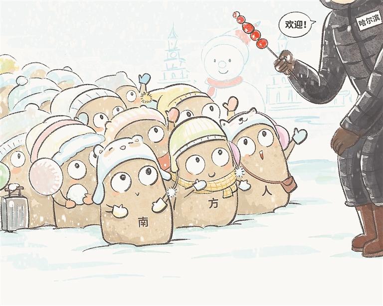 最近,“南方小土豆”火了!大批南方人涌向东北搓澡、看雪、滑冰、堆雪人、打雪仗……在东北天寒地冻的大街上,出现了一个个身材娇小、戴着可爱帽子、裹得严严实实、缓慢移动的南方人,被戏称为“南方小土豆”。一位好友不明所以,问我:“是因为南方人去搓澡搓出了很多泥巴,所以被叫‘小土豆’吗?”这话画面感极强,不禁让人想到在水龙头下冲洗土豆、慢慢给土豆搓泥巴的画面,更想到羞涩的南方人走进东北大澡堂,被用力揉搓、搓泥巴的画面,让人忍俊不禁。