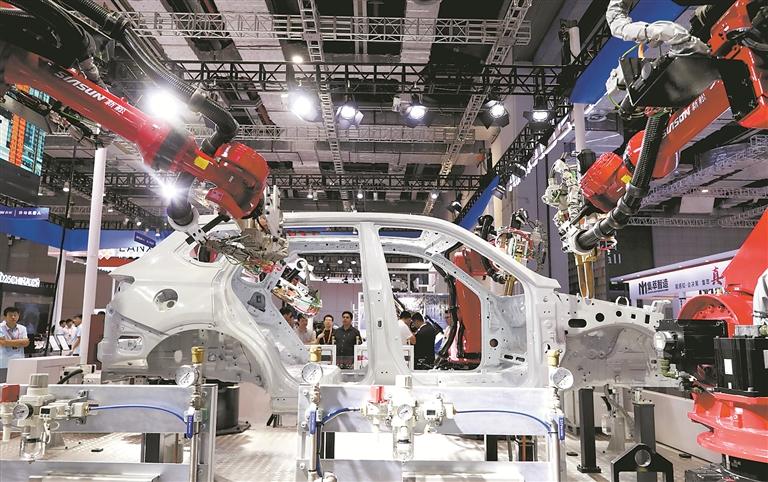 一组车身焊接机器人在第二十三届中国国际工业博览会上进行作业演示 (新华)