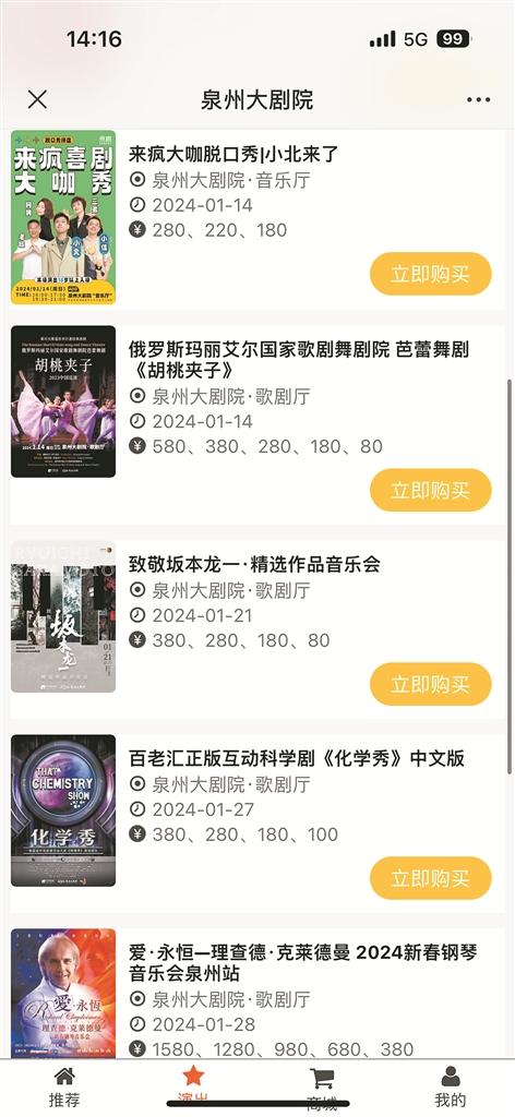 近几年,一大批比肩一线城市主流剧场的精品演出落地泉州,经典舞剧、芭蕾舞、现代舞、古典舞、音乐剧、歌剧、相声、小品、戏曲、杂技等多种类型的演出亮相。濮存昕、郑小瑛等多位知名艺术家参演的《中国唐宋名篇音乐朗诵会》,田沁鑫执导的中国国家话剧院明星版话剧《四世同堂》,杨丽萍导演的大型舞剧《平潭映象》,中国话剧巅峰巨作陕西人艺封箱之作《白鹿原》,陈佩斯、杨立新的力作——经典年代喜剧《戏台》等轮番上演,深受市民欢迎,不少演出一票难求。