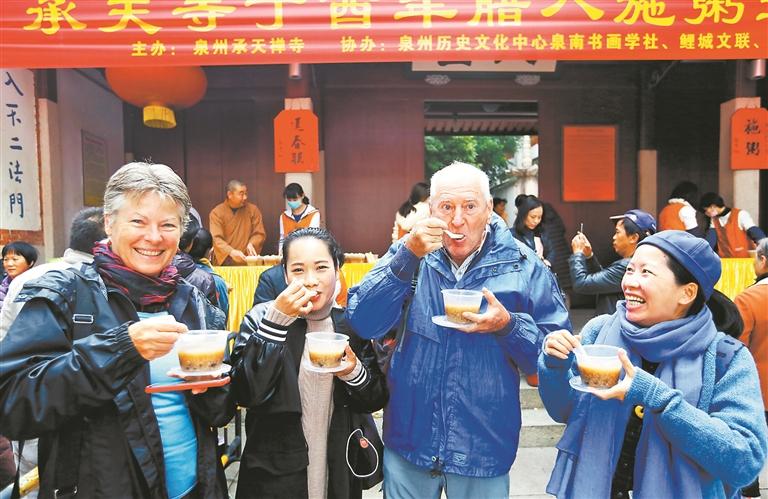 在泉州,还有不少人家通过寺庙施粥等方式品尝腊八粥。每年腊八,泉州少林寺、承天寺都会照例为民众广施腊八粥。承天寺姚秘书告诉记者,今年腊八粥的配方也与往年差不多。泉州鲤城海滨金山社区居委会赵主任介绍说,辖区有一位居民在浙江做企业,今年他将再次从浙江一家寺庙带回一些腊八粥,送给辖区内的贫困户和老人吃。