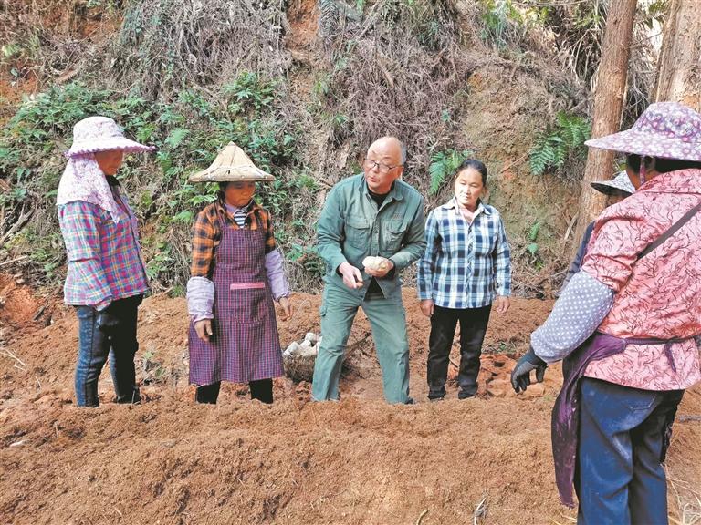 农业专家高允旺(左三)面对面传授林农们竹荪播种技术 (苏榆轴 摄)