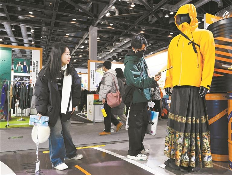 1月14日,ISPO Beijing 2024亚洲运动用品与时尚展在北京国家会议中心举行,吸引不少市民在周末前来参观。据悉,本次展览聚焦户外运动、冬季运动、露营生活、城市运动等方面,汇集了近500家参展商、近700个品牌。图为马面裙与冲锋衣的搭配吸引参观者。 (中新)