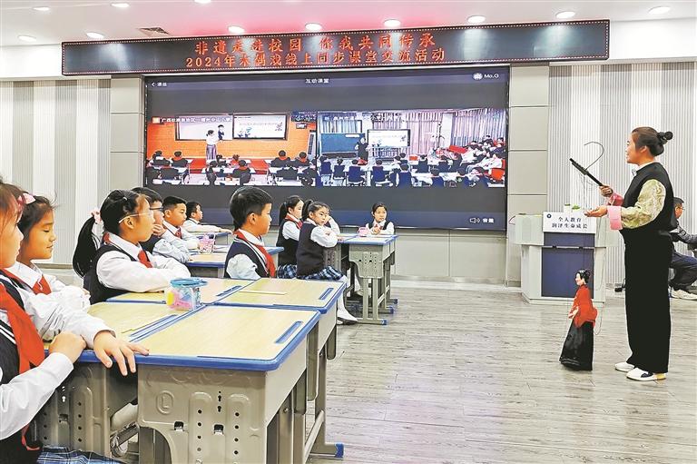 “泉州市通政中心小学跟梧州中山小学的同学们终于在线上见面了!我给同学们带来了一位新朋友!”随着热情的开场白,泉州市通政中心小学德育处主任林茵老师带着小“助教”——提线木偶亮相,向远在广西壮族自治区梧州市万秀区中山小学同学们打招呼,屏幕那端传来了一阵欢呼:“是提线木偶!”这是鲤城首个跨省“5G+专递课堂”,让两校师生云端相见,同上一堂课。这堂课讲解了泉州提线木偶和广西杖头木偶的结构和文化特点,并通过小组木偶知识竞赛、两地方言教学、简易杖头木偶制作、压脚鼓演奏体验等线上沉浸式文化交流。(李淑媚 摄)