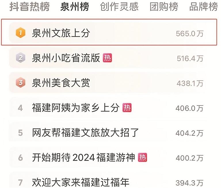 统计显示,1月12日11时至1月15日12时,“海丝泉州文旅之声”抖音号视频点赞量达21.4万,评论数达4.8万,转发量13.5万。3天时间,仅“海丝泉州文旅之声”视频号就发布30条视频,“海丝泉州文旅之声”抖音号涨粉1.4万多人,粉丝量逼近20万,“沈眉庄斓曦泉州蟳埔簪花围”“庄森喊小冻梨快来泉州”等泉州文旅短视频迅速抢占市民网友的手机屏幕。周末两天,#泉州文旅上分#,就以565万的阅读量登上抖音热榜泉州榜第一名。