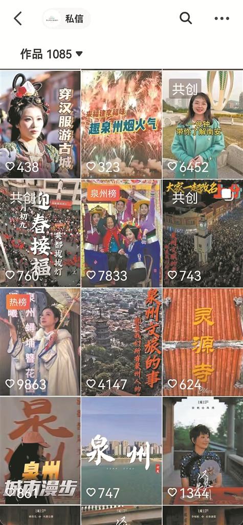 “这次我们还生成了四季泉州、烟火泉州、山海泉州等合集,多角度推介泉州。”“海丝泉州文旅之声”运营团队小编介绍,同时还频频与各县市区联动,网友欢呼:“终于看到家乡登上‘海丝泉州文旅之声’了。”此外,“安排‘00后’小编上岗”的文案率先发布后,在省内引领了一波潮流,各地市纷纷跟进。