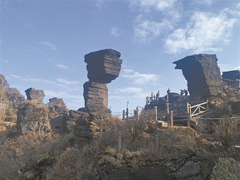 红云金顶上,一座弯弯的小石桥飞跨两座山头,一边供奉着现在佛释迦牟尼佛,一边供奉着未来佛弥勒佛。山顶上的这座小桥,据说是一位名叫梵僧的和尚,发动当地百姓建造的。动人的故事传说,构成了梵净山作为佛教名山的厚重历史和人文底蕴。据介绍,梵净山佛教起源于唐代,兴盛于明代,被誉为“天下众名岳之宗”,是佛教信众心中向往的“梵天净土”。