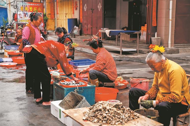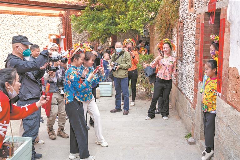 这里人头攒动如同“流动的花园”。全国各地的游客们纷纷来泉州簪花围,做一回“海的女儿”,蟳埔的蚵壳厝则是最好的背景,也是一道亮丽的风景线。蚵壳也就是海蛎壳,在蟳埔,随处可见头戴簪花围的阿姨们坐着开海蛎。