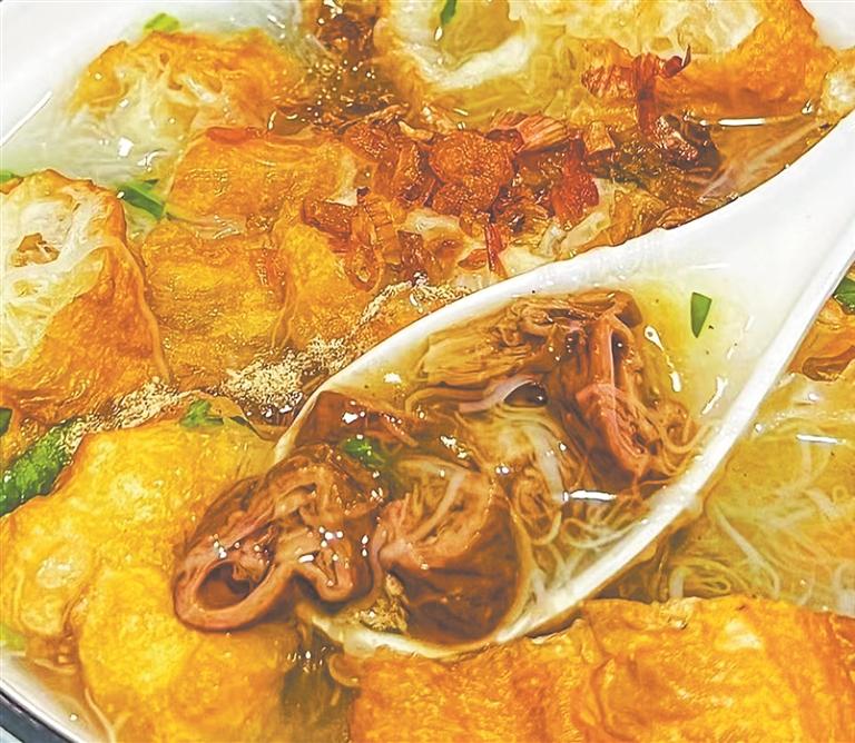 刚刚放寒假的大一女生吴米娜带着杭州的室友林雅来逛西街,她从网上找到了美食攻略,按图索骥开启西街美食之旅。到西街,她们先和钟楼合影,再来一个钟楼百年老字号的烧肉粽,一碗经典的闽南面线糊,“加上醋肉和大肠,配上油条,舌尖翻山越岭。”“打卡亚佛润饼店,从清末开店至今,已传承了四代人。”她们看着起落之间,一张薄如纸张的润饼皮就出来了,加入五花肉、海蛎、胡萝卜“包山包海”,感受“一卷百味”。她们还品尝香葱蒜蓉枝的香酥脆,吃到了泉州特色的元宵圆,花生在唇齿留香。林雅难忘的是土笋冻,沙虫加上蒜泥、酱油、醋,真是回味无穷。在裴巷小店,她们还品尝了古早味满煎糕。