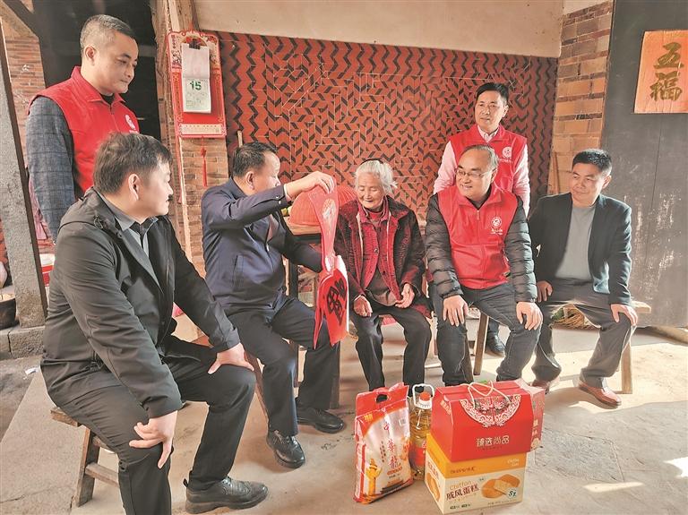 昨日,洛江区有关部门联合志愿者团队走进洛江虹山乡松角山村,走访慰问村里36位90岁以上的高龄老人。每到一处,志愿者就将米、面、油、牛奶、面包等慰问物资送到老人的家中,并与他们亲切交谈,叮嘱老人天气寒冷要注意保重身体。同时,查看老人居住环境,排除安全隐患,确保老人度过温暖安全的新年。图为志愿者给老人送上春联及生活物资。(王金植 黄明水 摄)