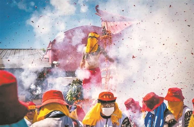 “‘炸寒单’的习俗就是从闽南流传到台湾的。”黄朝亮说,在台东地区,每年元宵节,民众戴上头巾装扮成“寒单爷”,仅用面罩及护目镜保护脸及眼睛,在这种情况下承受半个小时到一个小时的炮炸。他从小就对这样的民俗非常好奇,为力求真实展现,还特意当了一回“寒单爷”。