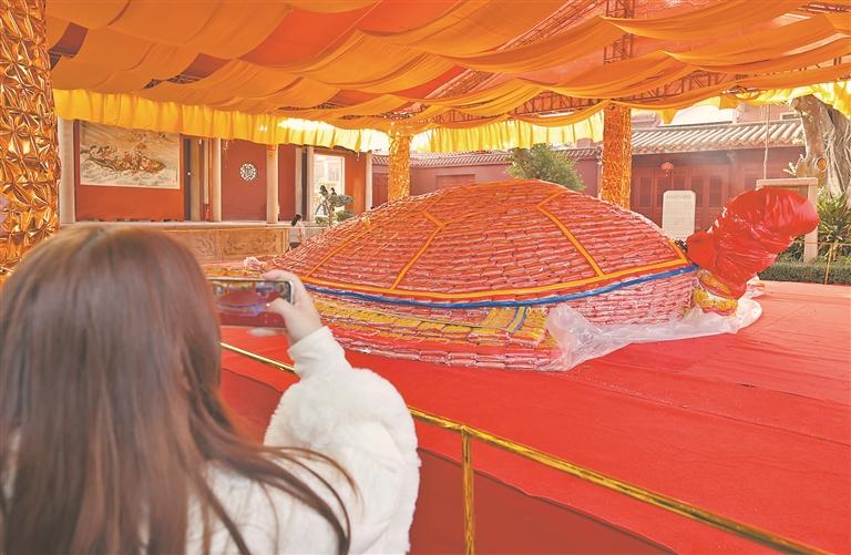 “乞龟”是泉州、澎湖两地极具特色的元宵民俗活动,泉州天后宫自2007年起,每年都与澎湖天后宫共同举办泉澎“乞龟”民俗祈福活动。记者了解到,今年泉州天后宫的“米龟”已经布置完毕,将于元宵节正式开放。泉州天后宫文物保护所负责人刘育民介绍,今年的“米龟”是历年来规模最大的一只,总共用米2.94万公斤。
