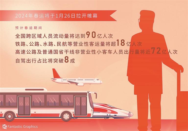 2024年春运将于1月26日拉开帷幕。今年春运期间全国跨区域人员流动量预计将达90亿人次,创下历史新高。综合运输春运工作专班副组长、交通运输部副部长李扬在发布会上介绍,今年春运期间,铁路、公路、水运、民航的营业性客运量将达18亿人次,自驾出行客流约有72亿人次。总体来看,今年春运路网流量在去年高位运行的基础上,将继续攀升并持续高位运行。
