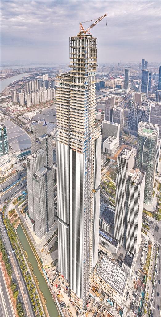 1月16日,南京金融城二期(东区)项目主体结构全面封顶。该项目位于南京市建邺区,总建筑面积约42.9万平方米,包含2栋超高层及4栋配套裙楼,其中主塔楼总高度为416.6米,是集办公、酒店、公寓、商业于一体的超大型综合性建筑群。这是1月16日拍摄的南京金融城二期(东区)项目主体结构(无人机照片)。 (新华)