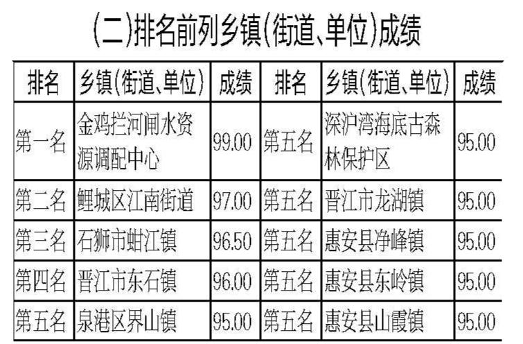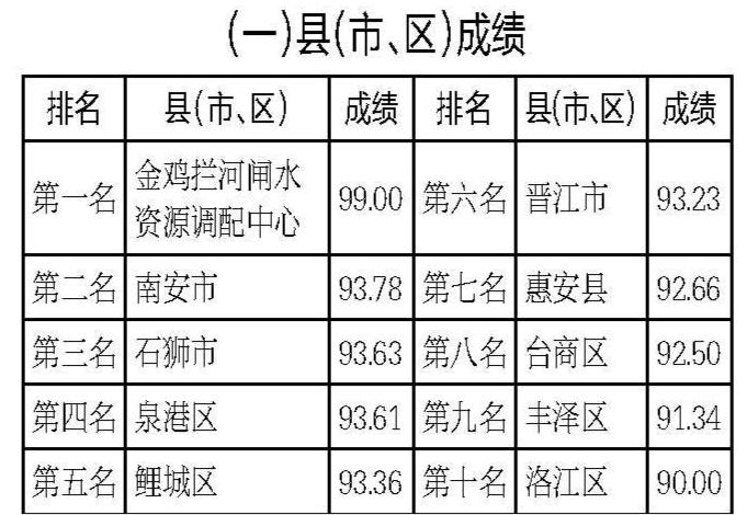本报讯 (融媒体记者杜婉琼 通讯员黄昱颖)去年12月份,市城市管理综合考评中心对全市海岸带(近岸海域和海岸线向陆一侧200米的陆域)和晋江河道(市区段晋江入海口至金鸡拦河闸上游100米)的环境卫生情况开展考评。在县(市、区)成绩中,金鸡拦河闸水资源调配中心位列第一,洛江区倒数第一。