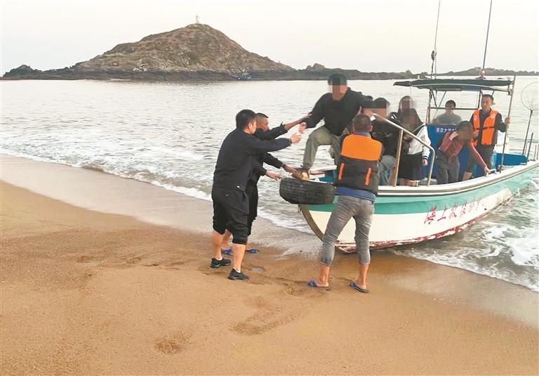 天色渐晚,尖峰屿周边风浪大、暗礁多,救援难度大。救援队队员根据水文环境,快速制定了救援方案,并用船上的木杆探索出一条没有暗礁的水路。半个小时后,救援队队员在尖峰屿的灯塔附近,将七名被困游客救上岸。“第一次被困在岛上,吓得腿都软了。幸好有你们在,我们才能安全回来。”在救援艇上,几名年轻人向救援队队员致谢。