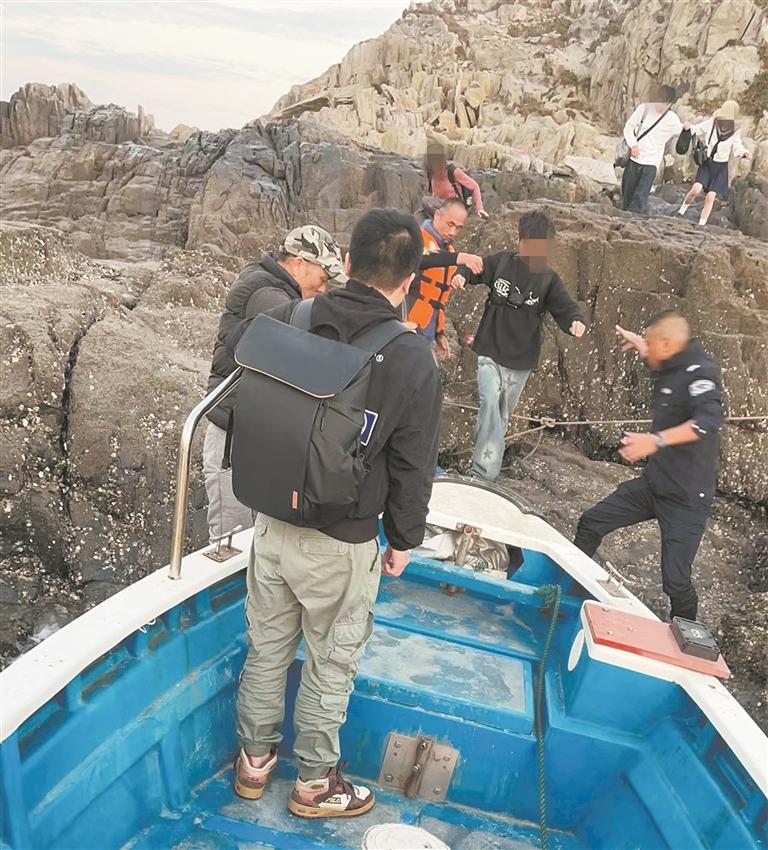 本报讯 (融媒体记者张晓玲 通讯员郭志强 文/图)“我们七个人被困在大岞的岛礁上回不去了,能帮帮我们吗?”近日,几名泉州中心市区的游客乘船至崇武大屿村尖峰屿游玩,不料返回时遇上退潮,船只搁浅,他们紧急向惠安县公安局崇武派出所求助。接到警情后,民警和崇武旅游警务海上联动救援队队员立即携带安全绳、救生衣等装备,登上救援艇赶往尖峰屿。