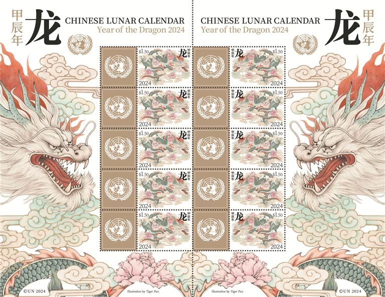 联合国邮政管理局2010年5月首次发行以中国生肖为内容的邮票,到2021年已发行了首轮12张生肖邮票。2024年的龙年邮票是第二轮生肖邮票的第3张,延续了第二轮生肖邮票版张的设计风格。版张左侧5枚邮票和右侧5枚邮票为镜像分布,左侧的龙与右侧的龙对望,增强了趣味性。