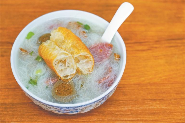那一天早上,舍友把我从温暖被窝里强行挖了起来:“走,暖暖身子去。”于是就睡眼惺忪地随着舍友走出宿舍。宿舍楼斜对面有一间小餐饮店,窗玻璃上写着“面线糊、豆浆、稀饭、油条、包子”,“面线糊”三字写得特别大,几乎占据了一半的空间。小店空间逼仄,6张桌子排得满满当当的,走路都要侧着身子。老板娘忽前忽后地招呼客人、搭配食材、拾掇碗筷、擦洗桌子。