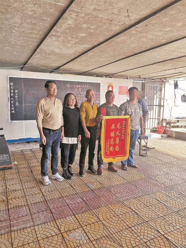 昨日下午,落水女子的家人给邱飞忠(右二)和吴锦风(中)送来锦旗。(受访者 供图)