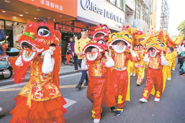 日前,丰泽街道新时代文明实践所、东涂社区党委和居委会联合丰涂社区幼儿园等多个单位开展民俗踩街活动。活动现场,社区腰鼓队打头阵,舞龙醒狮戏彩球,民俗戏曲齐“逗阵”,盛大的阵仗,卖力的萌娃,队伍所到之处吸引了周边众多市民驻足观看拍照,沉浸式感受了一场别具一格的民俗传承之美。(魏黎颖 摄)