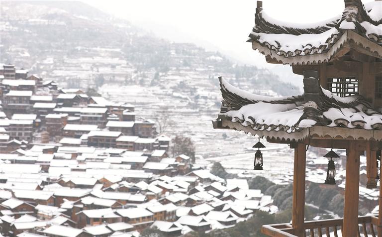 受寒潮天气影响,我国多地迎来降温降雪。图为1月22日拍摄的贵州省黔东南苗族侗族自治州雷山县西江千户苗寨景区雪景。(新华)