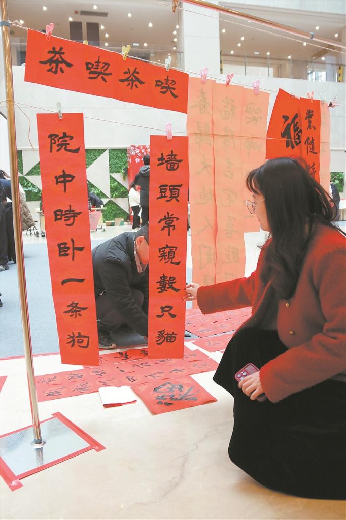 在晾晒区的另外一侧,一副用隶书书写的春联同样吸引了大家的眼球——墙头常窥数只猫,院中时卧一条狗,横批是喫(chī)茶喫茶。这副春联的主人黄女士说,她家里养了猫和狗,这副春联给她一种很安逸的感觉,于是就请书法家写一副,准备贴在自家大院里。黄女士也是一名中国传统文化爱好者,“我大学时学过三四年的毛笔字,隶书是我最喜欢的字体,今天看到这么多书法家在现场写书法,让我想起了大学时光,很有感触!”