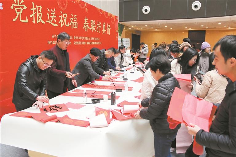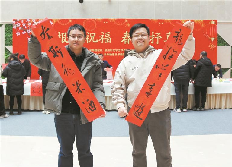 昨日上午,2024年“党报送祝福 春联抒真情”活动第六场走进泉州市公共文化中心工人文化宫,为市民送上新年祝福。本场活动由泉州晚报社、泉州市文联、泉州市书法家协会主办,东南公益、泉州晚报社书画院、福建省五建建设集团有限公司协办。