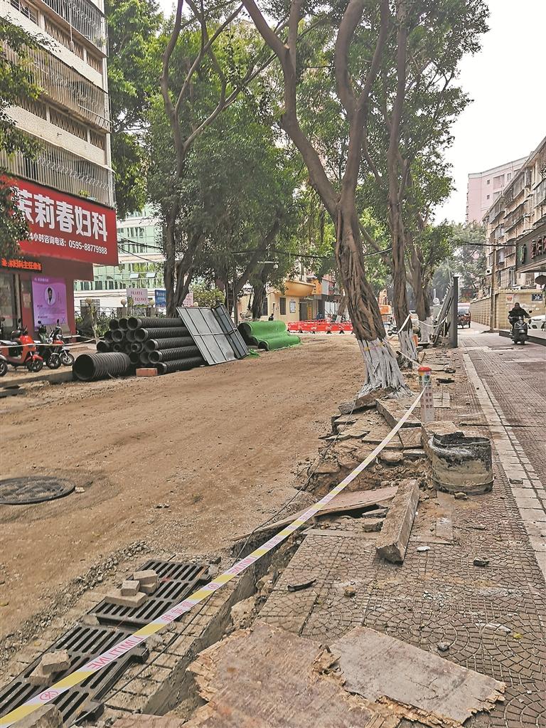 随后,记者来到迎津街。记者看到,迎津街津坂路至温陵路路段的路面已经被挖开,部分路面铺上沙子,并堆放着各类施工管道。施工路段设置围挡,施工人员正在里面作业。由于道路被挖,小车已无法通行,电动车则骑行在沿街店铺前面的人行道上。