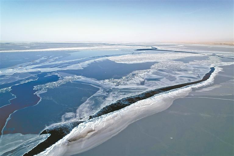 受冷空气影响,1月19日青海湖流域出现吹风天气,20日白天,黑马河气象站甚至出现16.2米每秒的大风,当日青海湖出现裂缝,长约98.77千米,最宽处宽约1.8千米。(无人机照片) (中新)