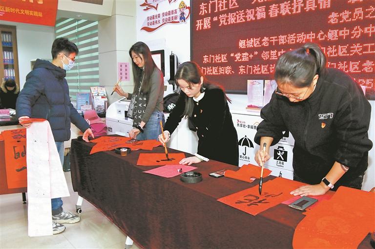 “喜居宝地千年旺 福照家门万事兴”“春临大地百花艳 节至人间万象新”……笔墨纸砚准备就绪之后,现场的11位女书法家们开始挥毫泼墨,笔走龙蛇,一副副寓意吉祥的春联和“福”字铺满了东门社区“党建+”邻里中心。