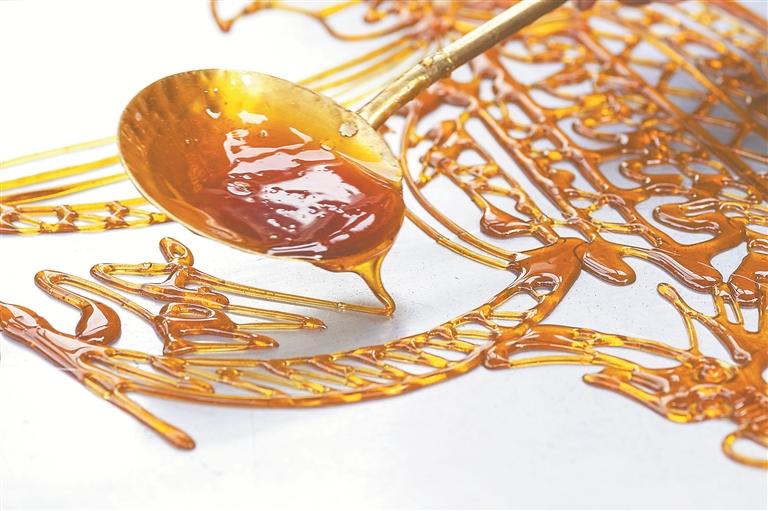 此刻夕阳打翻了红墨,在红砖古厝上信手涂鸦。古城烟火气扑面而来,林立的摊贩中,最抢眼的莫过于几家标着“非遗文化”的摊子。循着一抹糖味儿,我驻足在一家糖画摊前,只见那琥珀色的糖浆随着铁勺摆动而自然滴落,在空中轻盈地旋转、舞蹈。既具书法的遒劲有力,又富绘画的恣意纵横,行云流水间,一个个活灵活现的十二生肖糖画就此映入眼帘。