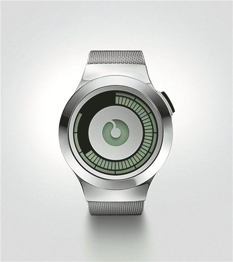 这款手表的表盘中用平行环绕的光柱来呈现时间,内圈60格表示分钟,外圈12格则代表小时,让时间得到另一种美的展示。