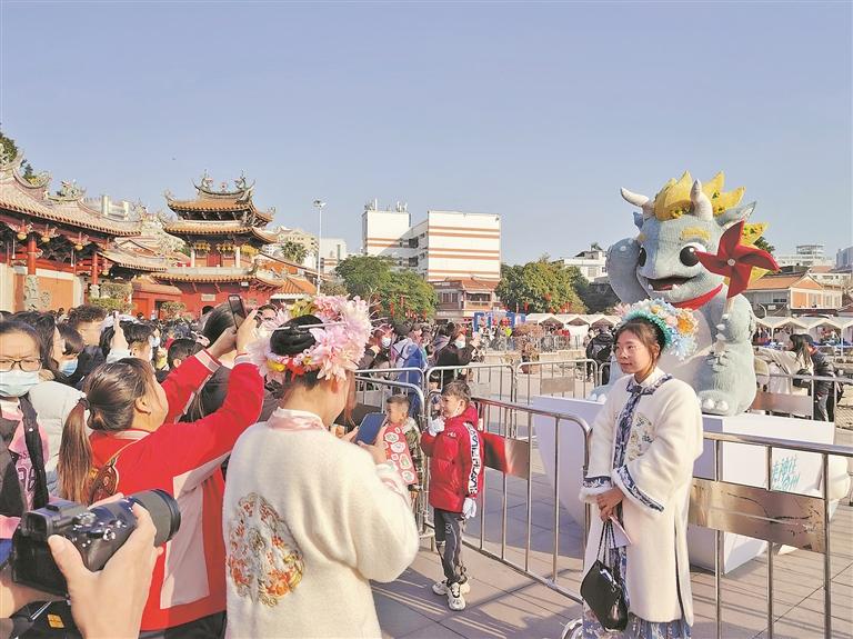 泉州“寻龙记”大幕拉开后,“追龙”打卡成为不少年轻人的热门活动。每逢“十龙九子”生肖艺术装置出街,来自丰泽的小林和朋友就早早地赶到打卡地等候,“我们已经追了蒲牢、赑屃和囚牛,不仅拍照合影,还拍摄了小视频发给外地的朋友,邀请他们春节来泉州旅游打卡!”